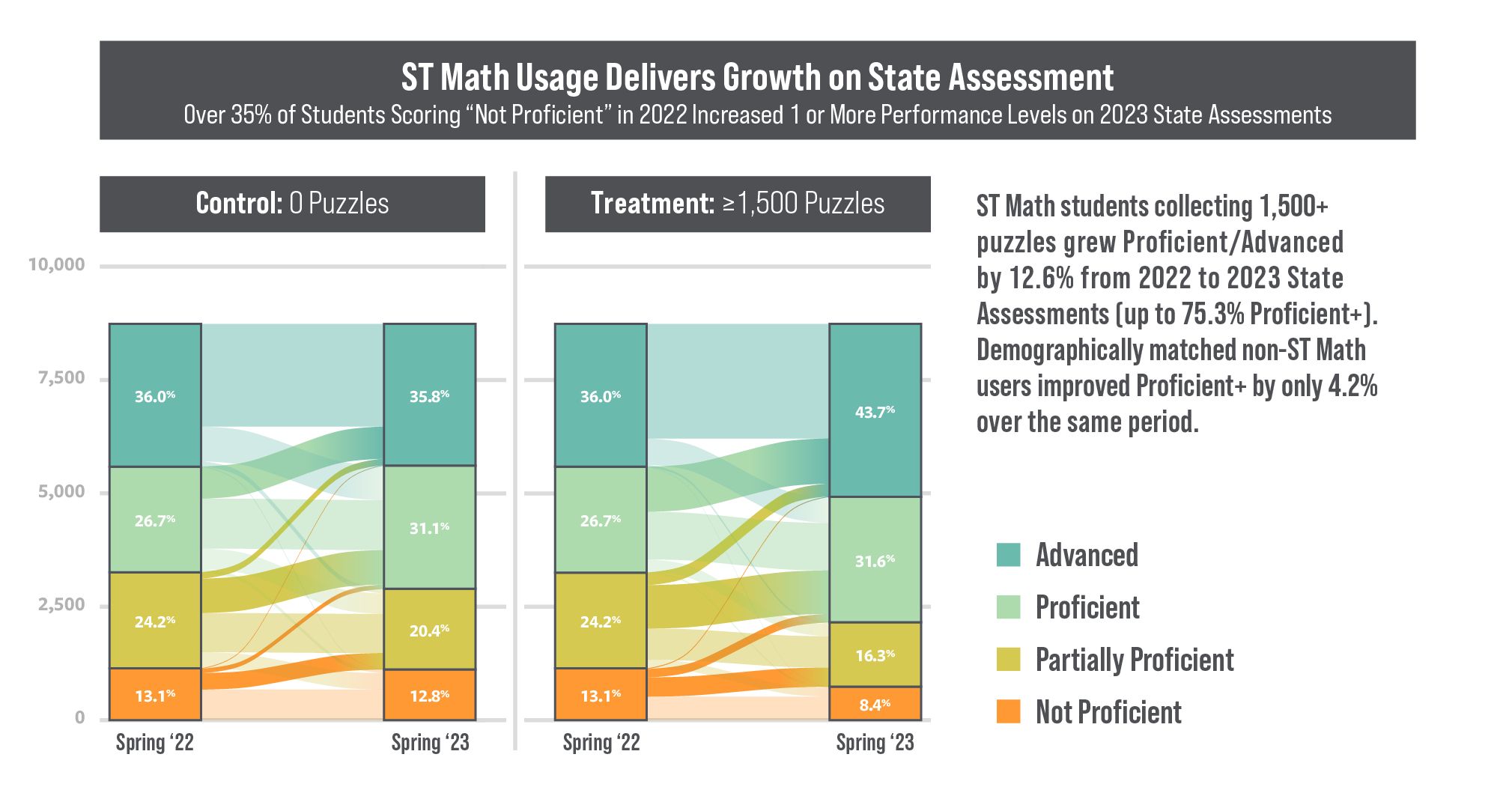 Study after study demonstrates students theoretically learn more by doing, by being active learners rather than passive receivers of knowledge. But does this approach work in the classroom? Can it work at scale? In Texas, the results were clear. The Texas Education Agency (TEA) made ST Math, a visual math program that uses a game-based, creative reasoning approach, freely available for all Texas students, and then tracked STAAR Math performance growth. Forty-eight percent of students who used ST Math dramatically improved, and remarkably, students at Did Not Meet levels decreased to near elimination. Also, ST Math and creative reasoning helped all students, even English Learners and Special Education students.